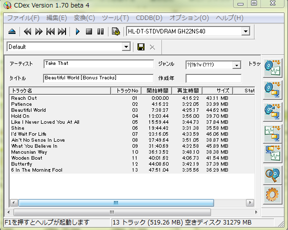 すると、CDexが自動的に、CDのデータをデータベースに問い合わせて表示します。