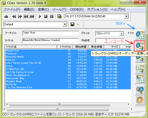 今回は、CDをまるごとリッピングしたわけですが、すきな曲を数曲だけリッピングしたいこともありますね。
