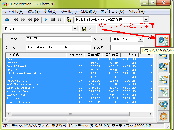 音楽CDから音声ファイルを抜き出すCDリッピングツール