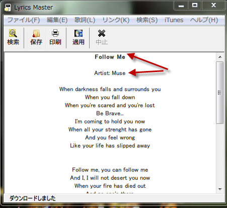 タイトルとアーティストで検索して、歌詞が表示されました。