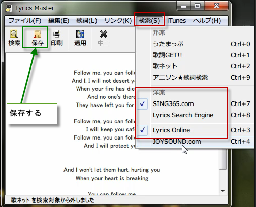検索して表示された歌詞はテキスト形式で、PCに保存できます。