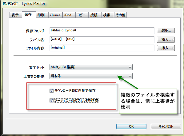 歌詞を保存する場合は、保存先のフォルダを指定します。