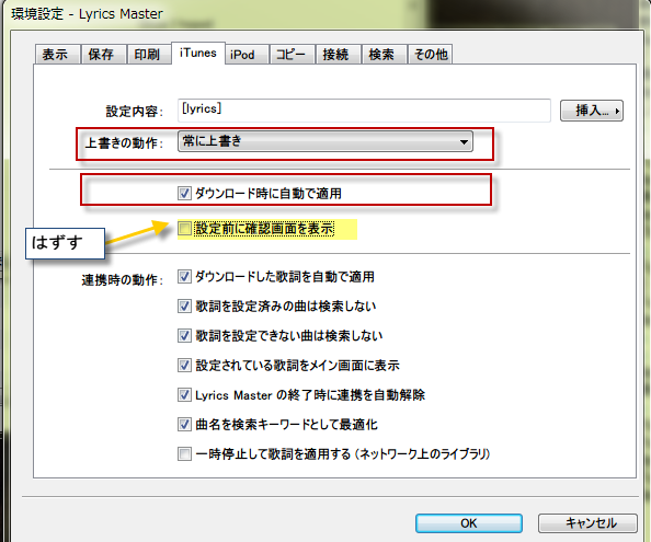「一時停止して歌詞を適用する (ネットワーク上のライブラリ)」以外は、すべてチェックを入れて使っています。