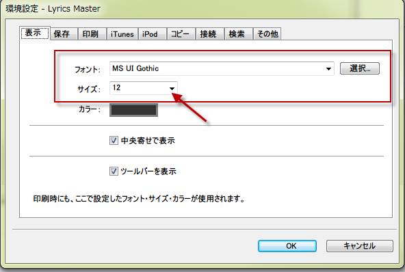 まず表示タブで、歌詞を表示するフォントとサイズ、カラーを指定します。表示する歌詞が日本語なら、日本語フォントに変更した方が、見やすいです。