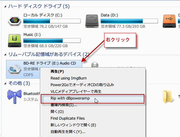 あるいは、直接CDを入れたドライブを右クリックして、Rip with dBpoweramp をクリックします。