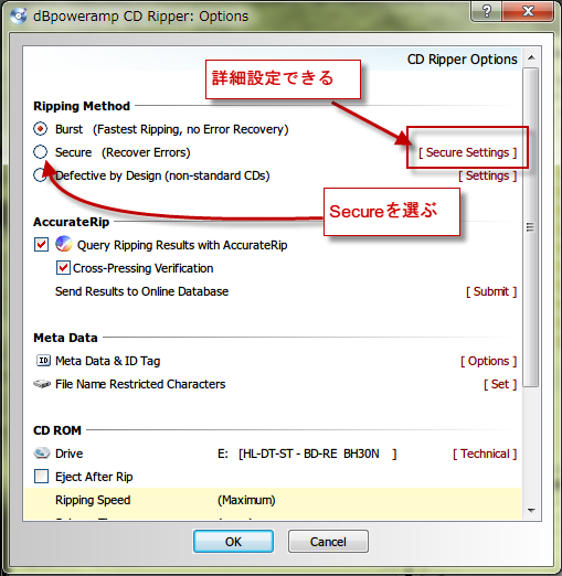 Secure セキュア(Recover Errors)で十分なリッピング性能が得られていると思っています。