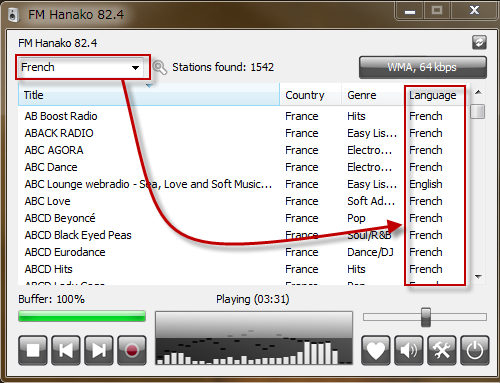 語学学習中ならば、左上の検索ボックスにキーワードを「French」などと入力することで、放送局を絞り込んで表示することができます。