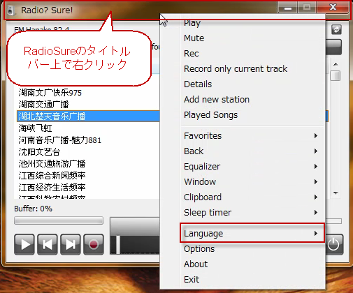 RadioSureのタイトルバー上で右クリックします。