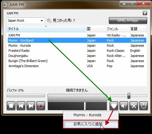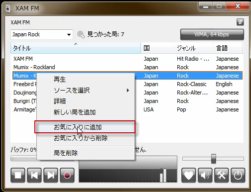 お気に入りの局を登録するには、登録したい局を選択して、右クリックメニューから「お気に入りに追加」をクリックします。
