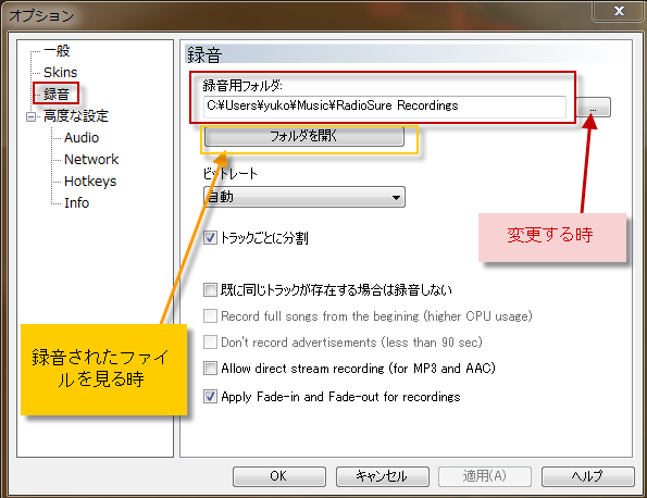 RadioSureは、再生中の音楽を録音することができます。録音前に出力フォルダの確認をしておきましょう。