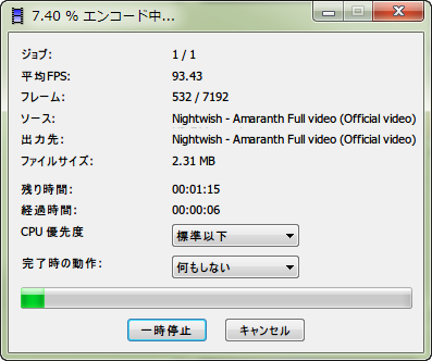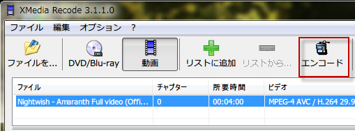 保存場所などの確認をし、「エンコード」をクリックして、エンコードを開始します。