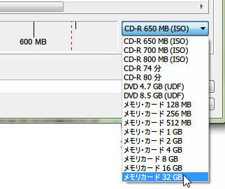リストタブにある、メディアを選択する▼を押し下げて対応するメディアと容量を選択します。