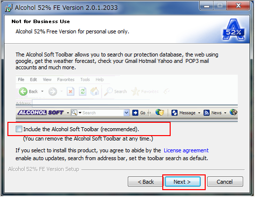 ラインセンスアグリーメントの同意すると、今度は、アルコールツールバーをインストールしますか?と聞いてきます。