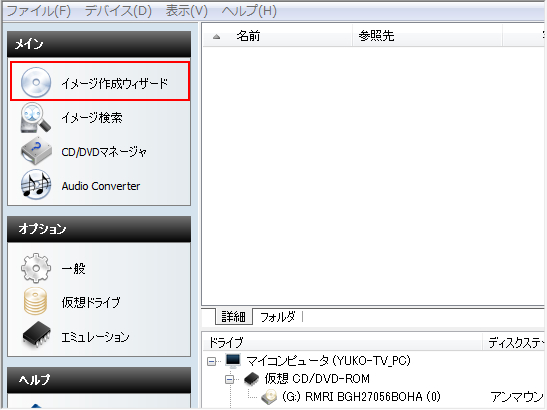 では、さっそく届いたばかりのCDから、イメージを作成してみることにします。イメージ作成ウィザードをクリックします。