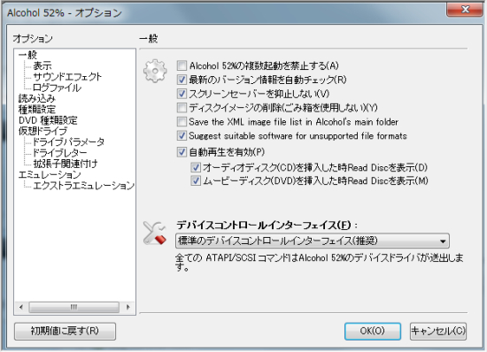 まず、一般項目ですが、ここでは一般的な項目について、例えば自動再性を有効にするかどうか、デバイスコントロールインターフェイスをどうするかなどの選択を行います。