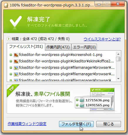解凍が終わると、"作業結果"ウィンドウが表示されますから、フォルダを開くボタンをクリックして、解凍先フォルダに移動できます。