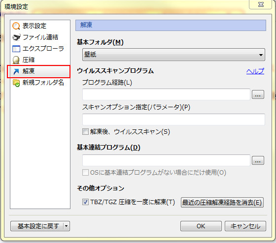 環境設定が開きました。右側のメニューから解凍をクリックします。