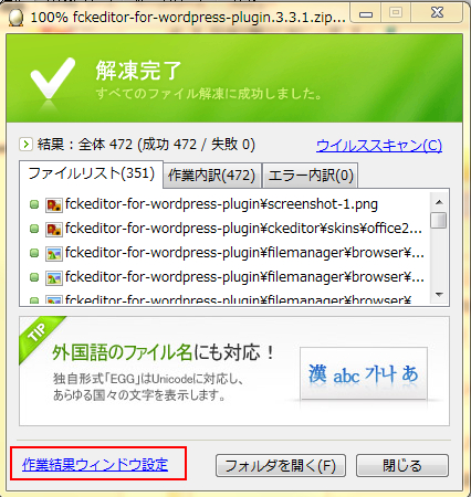 解凍が完了したあとの作業結果ウィンドウの下にある、