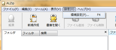 ALZipを起動し、メニューのファイルから圧縮ファイルを開きます。