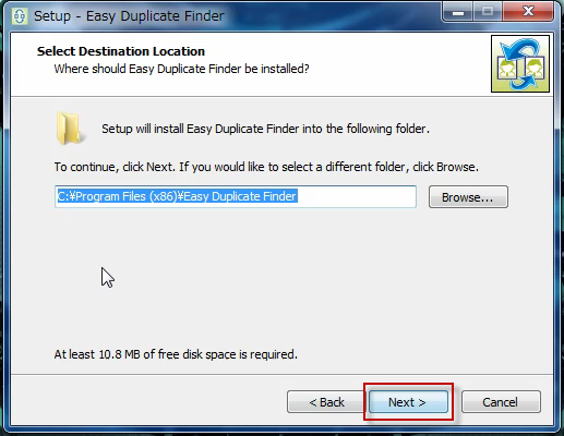 インストール先フォルダを指定します。通常はそのままでかまいません。Nextをクリックします。