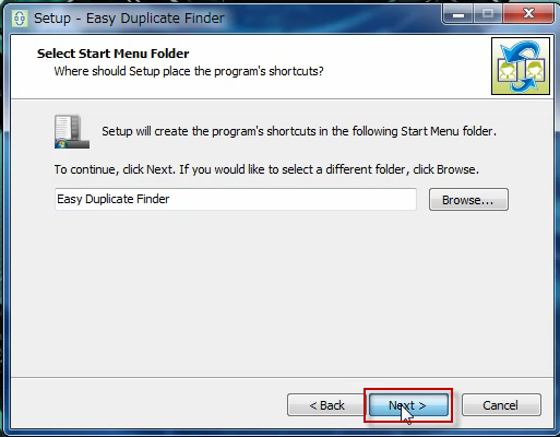 スタートメニューフォルダーの設定です。特に変更する必要はありません。設定のままでクリック。
