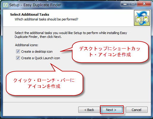 Create a Quick Launch icon については、チェックを外していいでしょう。毎日つかうものではないので。
