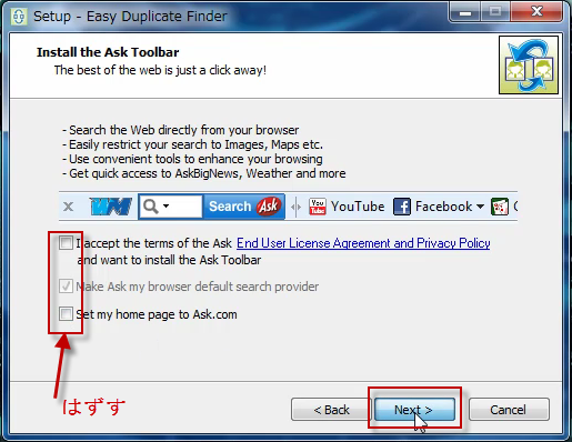 「Ask Toolbar」というツールバーのインストールを促す画面です。