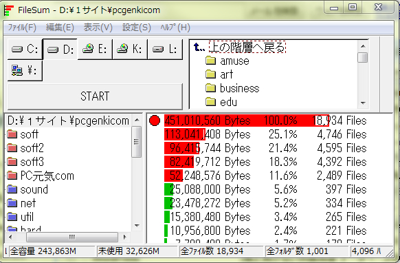 このソフトは、どのディレクトリが容量を食っているのか、ディレクトリの子、孫までも計測するソフトです。