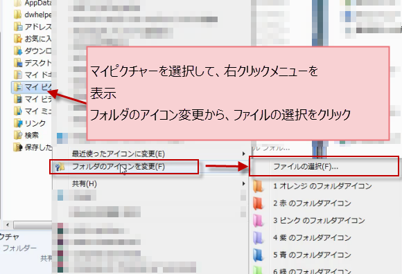 通常は、変更したいフォルダを選択して、右クリックメニューから、フォルダのアイコンを変更を選択します。