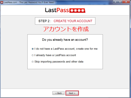 次はアカウントを作成します。「Do you already have an account?」ときいてきますので、まだ持ってない人はデフォルトのまま、「I do not have LastPass account」を選びます。