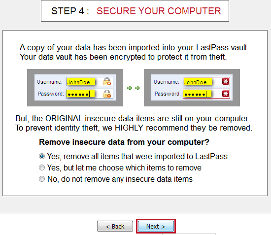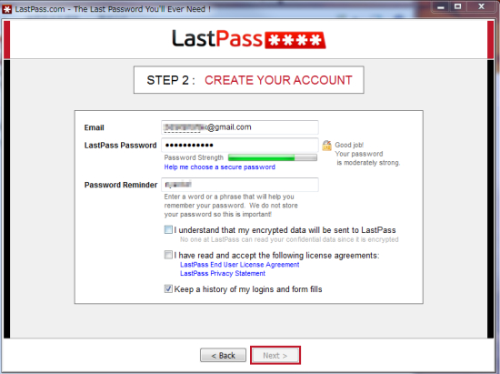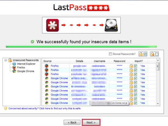 LastPassがデータを収集して安全でないデーターを暗号化しました。Nextをクリック。