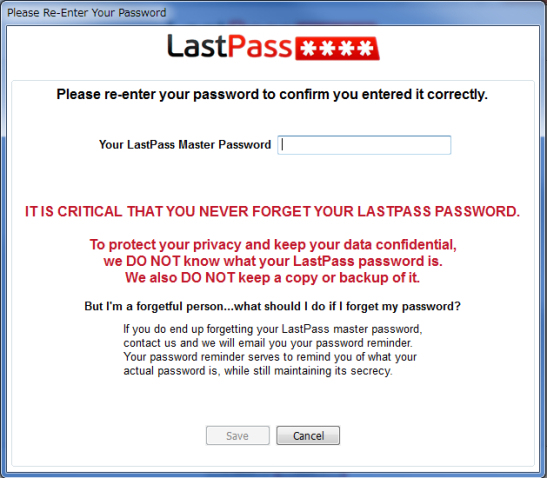 「あなたのプライバシーを守り、あなたのデーターを秘密にするために、私たちは、あなたのLastPassパスワードが何かをしりませんし、バックアップもコピーもしません。」