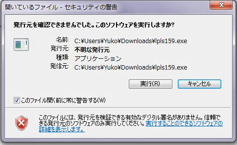 セキュリティの警告画面が出ても、自分でたった今ダウンロードしたのですから、安全ですので、実行をクリックします。