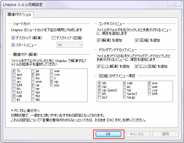 解凍ソフトを初めてインストールする場合や使い慣れている場合でも、デフォルトのままでOKだと思います。