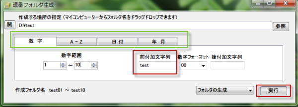 サブフォルダ群を生成する場所と、数字範囲、前付加文字列、数字フォーマット、後付加文字列、を指定して実行します。
