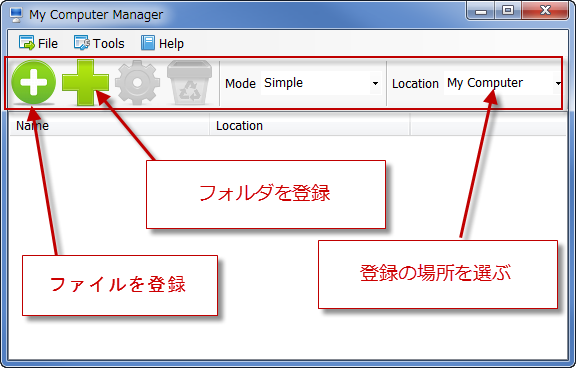 My Computer Managerは、マイ コンピュータ やコントロールパネルのようなアクセスのしやすいところに、普段良く使っているファイルやフォルダ登録することで、すばやくファイルやフォルダを使うことができます。