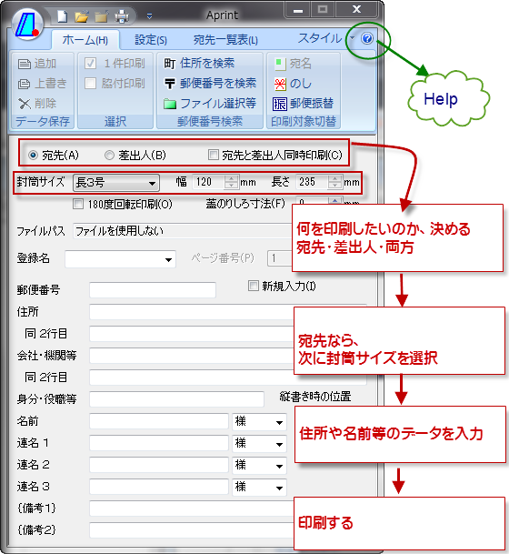 Aprintのヘルプは、右側の上の?です。