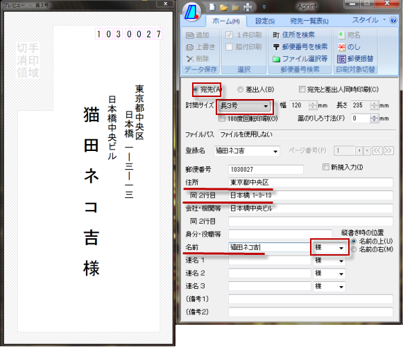 「宛先」と「差出人」両方を印刷したい時は、