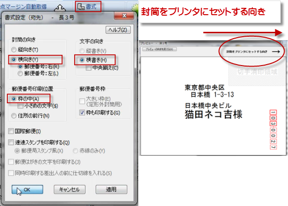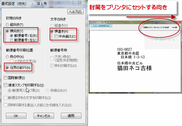 プレビューで、封筒をプリンタにセットする向きが表示されるので、間違うことがありませんね。