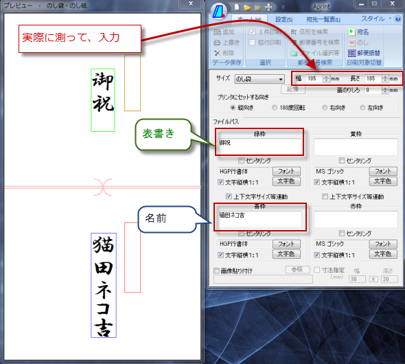 そのあとで、Aprintで表書きと名前を印刷します。