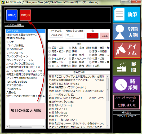 こちらは、小説に登場するアイテムを全部登録するところです。