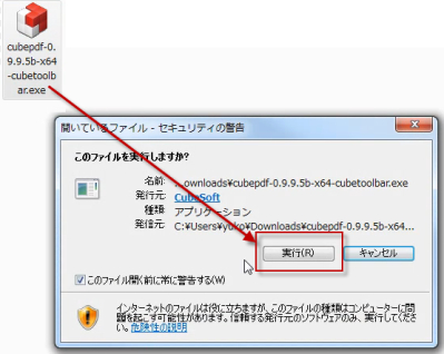 実行の際に、このソフトウェアを実行しますか?という、セキュリティの警告が表示されますが、