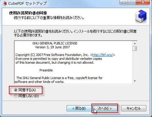 使用許諾に同意します。次へをクリック。