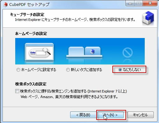 次にキューブサーチの設定という項目でホームページに設定するか、タブを追加するか、何もしないかと聞いてきます。