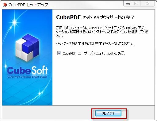 「完了」を押してCubePDFのインストールが終わりです。