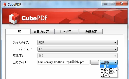 また、PDFファイルの生成形態で上書きか、結合か、リネームかを選択することができます。