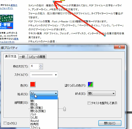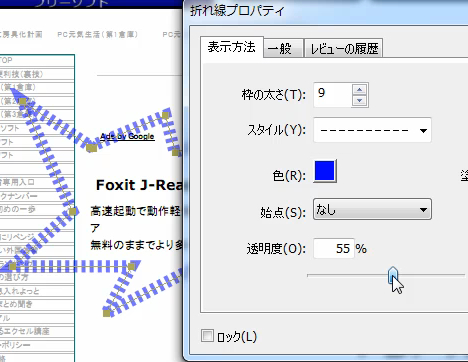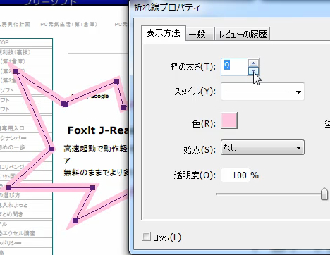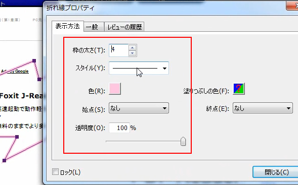 折れ線プロパティダイアログボックスが表示されました。表示方法タブで、線の太さ、線種=スタイル、色、始点、終点の形状。透明度などの設定ができます。