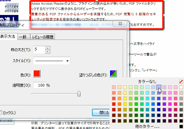外枠だけの四角形のプロパティを表示して、塗潰しの色を選択しました。
