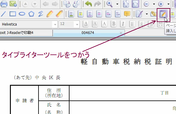 タイプライターツールを使うと、PDFファイルの好きなところに文字を書き込むことができます。この機能を使って、ダウンロードしたPDF申請書等に住所・氏名等の必要事項を書き込むことができます。