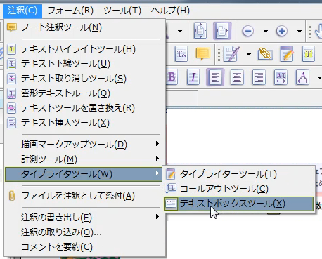 タイプライターツールは、アイコンの他に、メニューから注釈をクリックして、タイプライターツールを選択。